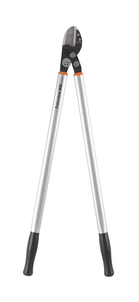 Coupe-branches à enclume professionnel avec action de levier et bras en aluminium. L’action de levier offre 50% de puissance en plus pour couper les grosses branches sans effort. Lame à revêtement en Xylan anti-frottement et robuste pour une pénétration plus facile dans le bois mature et sec. Longue arête de coupe pour la coupe des petites branches bien insérées entre les lames et pour la coupe des grosses branches au plus près du boulon central.